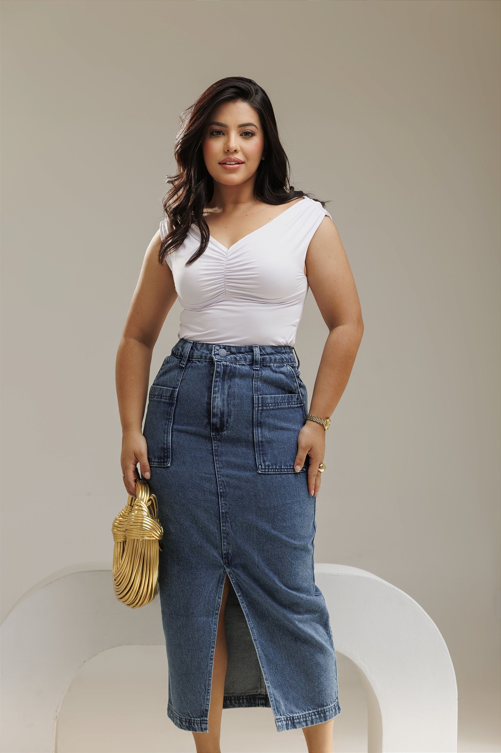 Saia jeans maxi midi confeccionada em tecido 100% algodão, garantindo estrutura, durabilidade e conforto ao vestir. Possui lavagem marmorizada, que confere um visual moderno e sofisticado à peça. Conta com bolsos funcionais, agregando praticidade ao design, além de recorte que valoriza a silhueta. Modelo versátil, ideal para composições casuais ou elegantes, perfeita para diversas ocasiões.